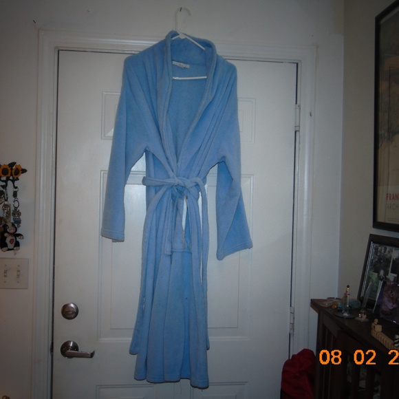 Long belted blue robe. Synthetic fiber makes a great after bath apparel