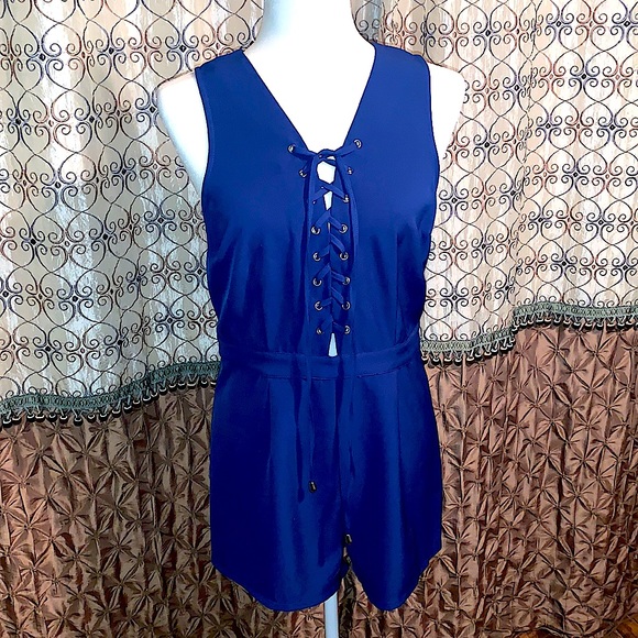 Sleeveless Blue Romper w/ lace tie up at bust & zip up back. Size Large, 90 % Poly 5% Spandex