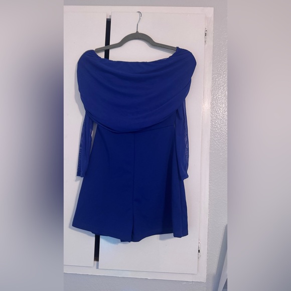 BNWT. Kendall Rushed Romper. Chic blue romper with draped neckline. Perfect for any occasion.