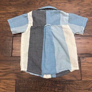 Boys' short-sleeve button-down Jack Shirt from Blue Rooster/Pink Chicken with a thick stripe pattern featuring white and different shades of blue. Great condition, size 3Y.