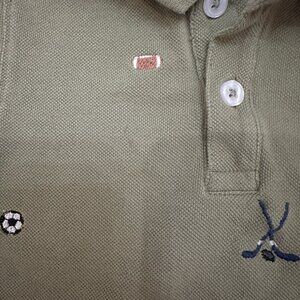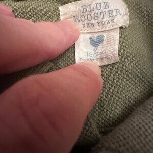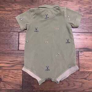 Olive green romper from Blue Rooster/Pink Chicken with embroidered sports pattern (soccer, football, lacrosse, hockey). Very small light stain (see photo), otherwise great condition. Size 18-24 months.