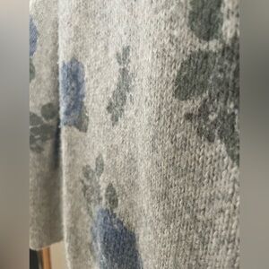 Grey with blue rose print crew neck sweater. Women’s size small. Slight bell sleeve. Minor piling on sweater. Lucky Brand.