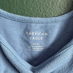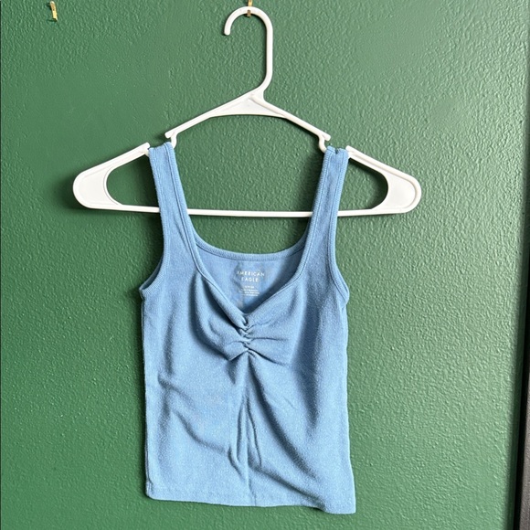 Light blue tank top with ruched detail. Soft and comfortable. Ideal for casual wear.