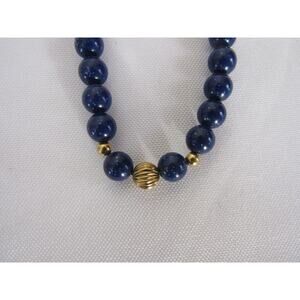 Blue Round Gemstone Beaded Gold Tone Necklace Long 32" Whimsical Minimalist Oval