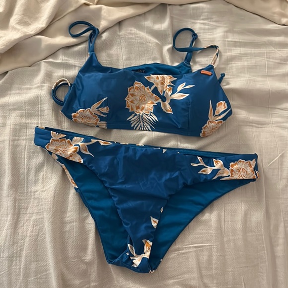 Worn two times only! Bottoms are moderate coverage and top is so cute and comfy I love the tie side details. Bottoms are large but I feel like they could even fit a medium