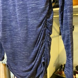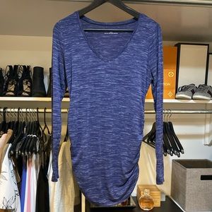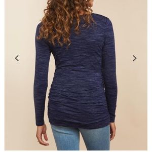 This marled navy blue top has full length sleeves. The sides are ruched. This is a form fitting top. Purchased originally from Motherhood Maternity store.