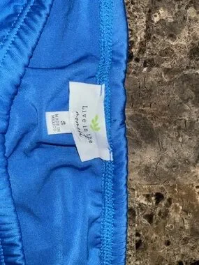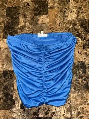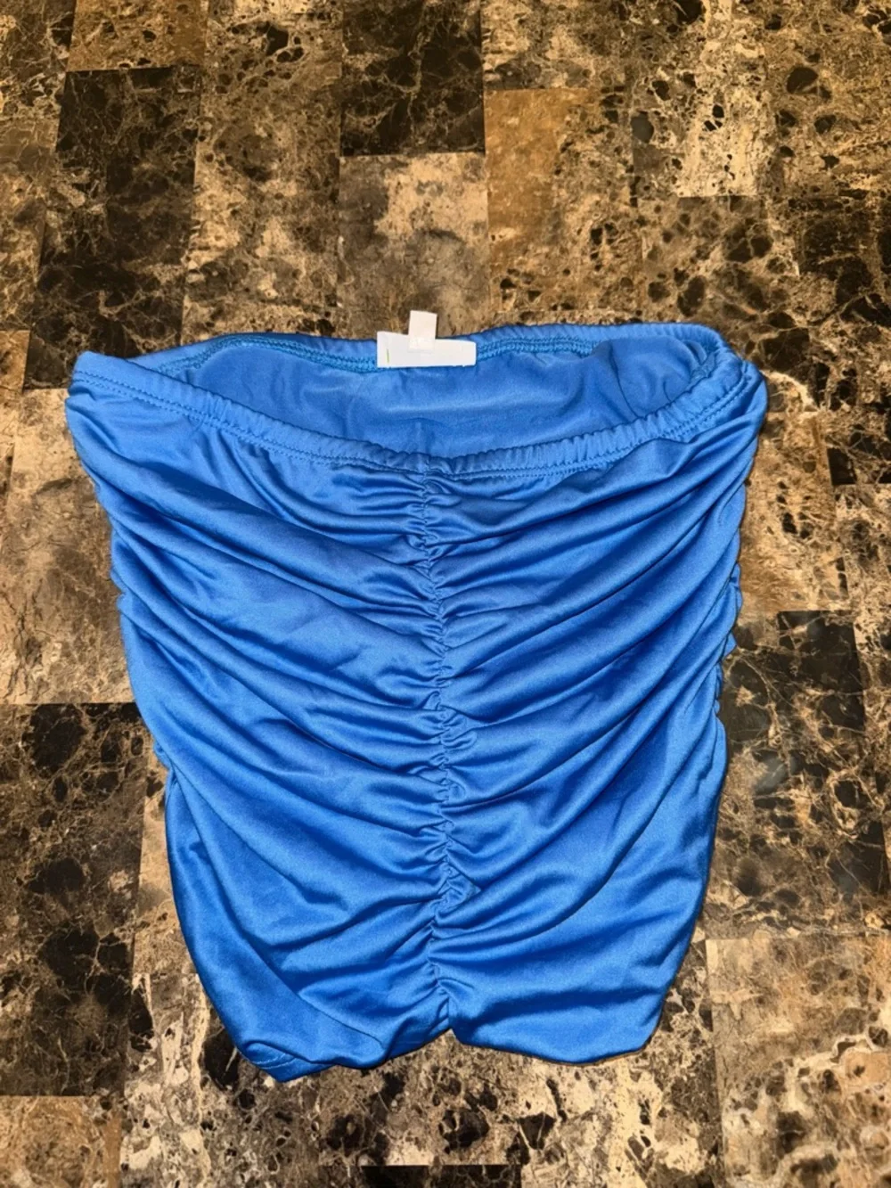 Bright blue strapless top with center ruching. Smooth stretch fabric. Simple, flattering silhouette.