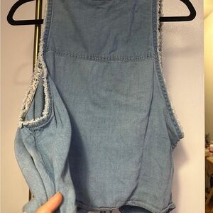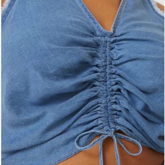 • Cropped denim top w/ ruching at the chest and frayed detailing