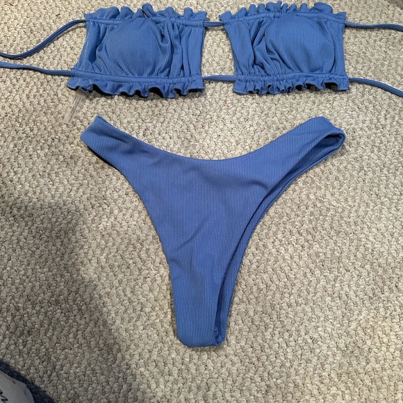 Stylish blue bikini set. Features ruffle details. Perfect for the beach.