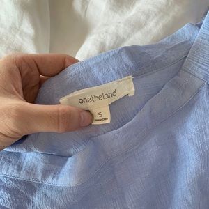 Details: Onetheland light blue blouse with ruffle sleeves, light and breathable material, can be tied (shown in photo)