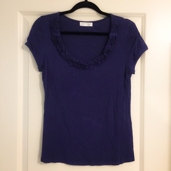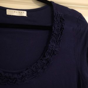 Kenar brand short sleeve tee with ruffles around neckline. Small hole near brand label as shown in pic 3. Missing size tag but fits like a Medium. Measurements are: 16.5” from arm pit to arm pit x 24.5” long from shoulder to hem. Very soft material. Has some stretch.