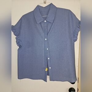 Elevate your wardrobe with this stylish blue button-up top. Featuring charming ruffle sleeves, it's perfect for any occasion.