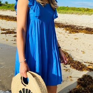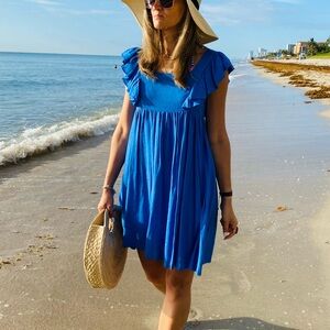 Embrace summer vibes with this stunning blue dress featuring charming ruffle sleeves. Perfect for any occasion.