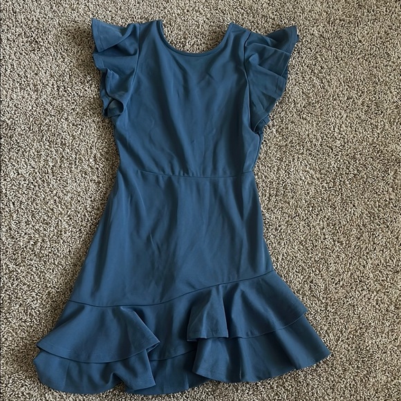 Chic blue dress with ruffle sleeves and hem. Perfect for any occasion.