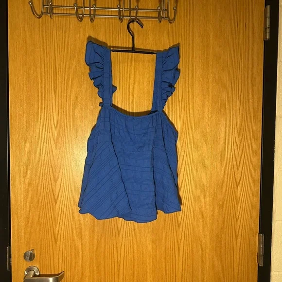 Chic blue top with ruffle straps. Perfect for casual outings. Lightweight and stylish.