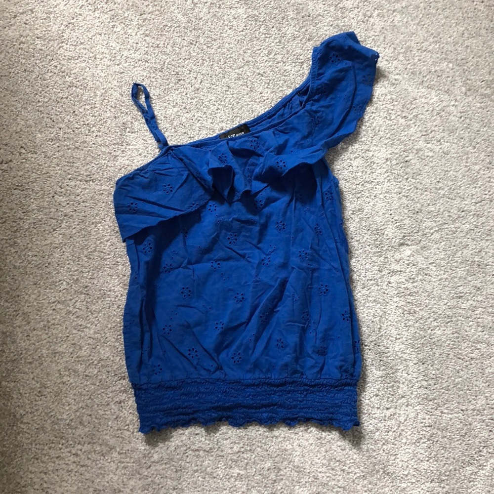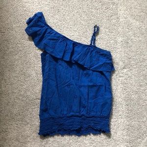 Blue ruffle top featuring a floral cutout design. One shoulder has an adjustable strap while the other is ruffled. Bottom is elastic, and super stretchy! Worn but well cared for.