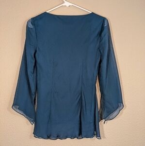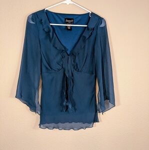 Picturing the Blue Ruffle V Neck Career Top with 3/4 Sleeves by b.i.y.a.y.c.d.a. Career.