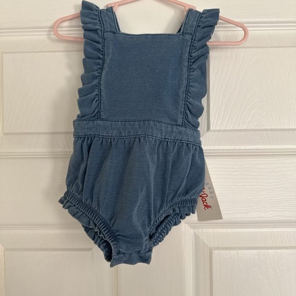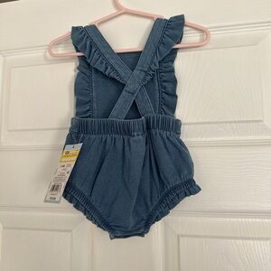 Adorable blue baby romper with ruffled straps. Perfect for a cute and comfy look.