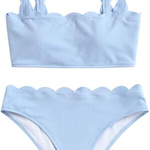 Stylish blue bikini set with ruffled edges. Perfect for a day at the beach.