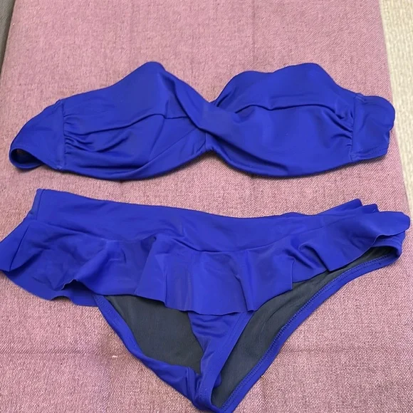 Stylish blue bikini set with ruffled details. Perfect for a chic beach look.