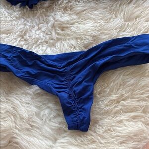 blue bikini set with ruffled, off the shoulder top. Bottom is scrunched bottom (minimal coverage)
