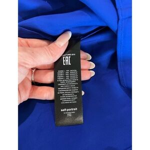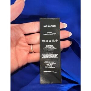 Elegant blue blouse with ruffled details. Features lace accents and long sleeves. Perfect for a stylish look.