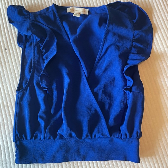Stylish blue blouse with ruffled sleeves. Perfect for any occasion.