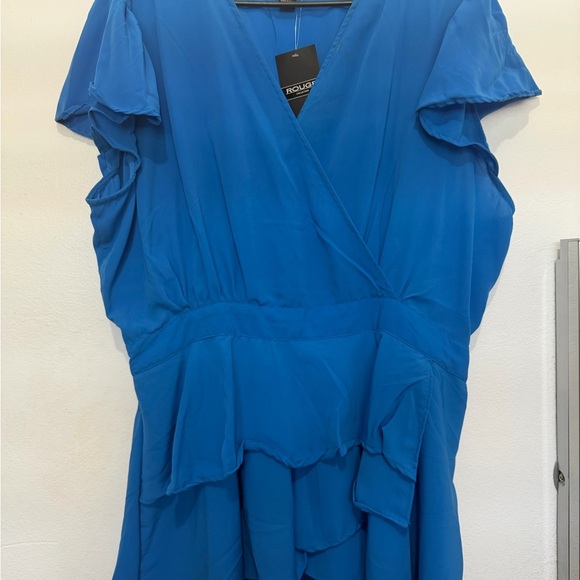 Elegant blue blouse with ruffled sleeves and layered design.