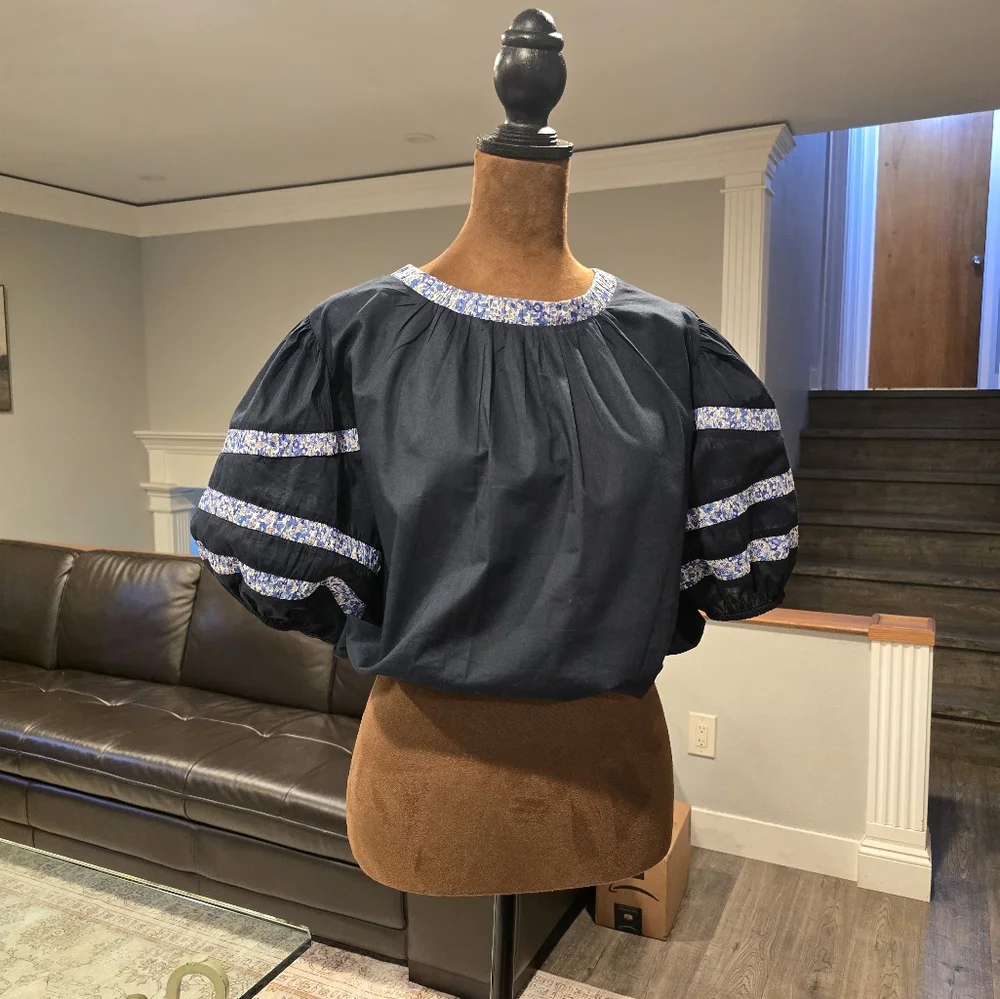 This stylish blue blouse features a ruffled design and a boxy silhouette, offering a chic and modern look. Perfect for any occasion, it adds a touch of elegance to your wardrobe.