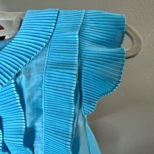 Chic blue blouse with ruffled details and button-up front. Perfect for casual or formal occasions.