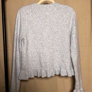Stylish blue cardigan with ruffled edges and button-up design.