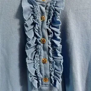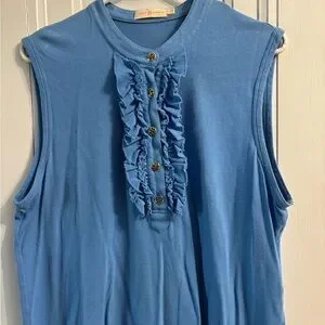 Stylish blue sleeveless polo top with ruffled detailing and gold buttons. XL