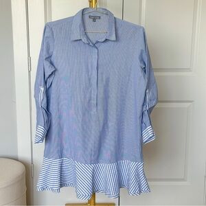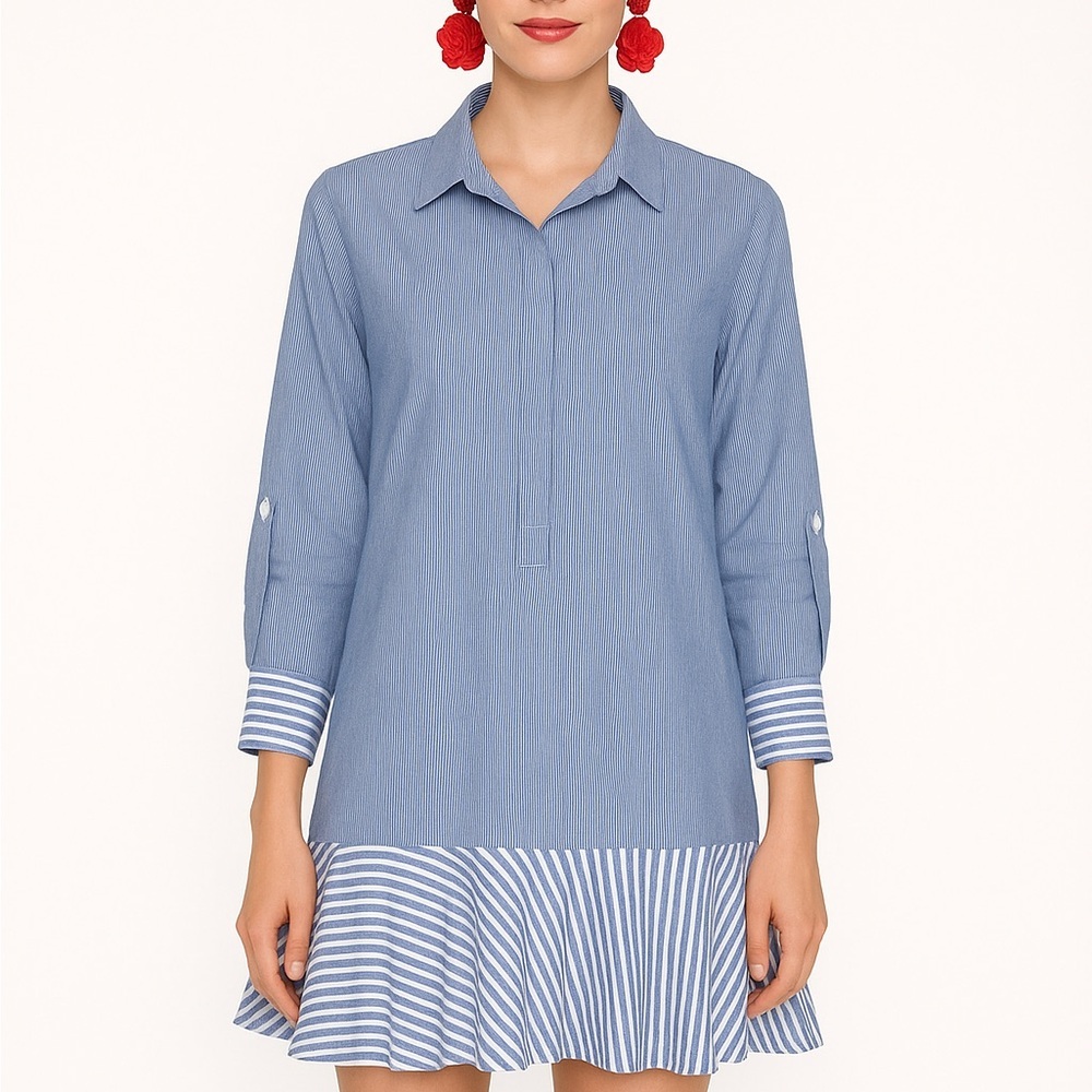 This charming mini dress features a playful ruffled hem in contrasting blue and white stripes, adding a touch of whimsy to its classic shirt style. The notched collar and 3/4 cuffed sleeves enhance its casual yet polished look, making it perfect for work or a relaxed day out. Crafted in a comfortable fabric, it offers a flattering silhouette that combines elegance with everyday wearability.