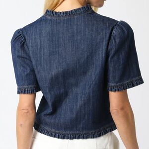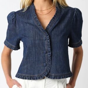 NWOT. Stylish blue denim top with ruffled details. Perfect for casual outings. Reformation style.