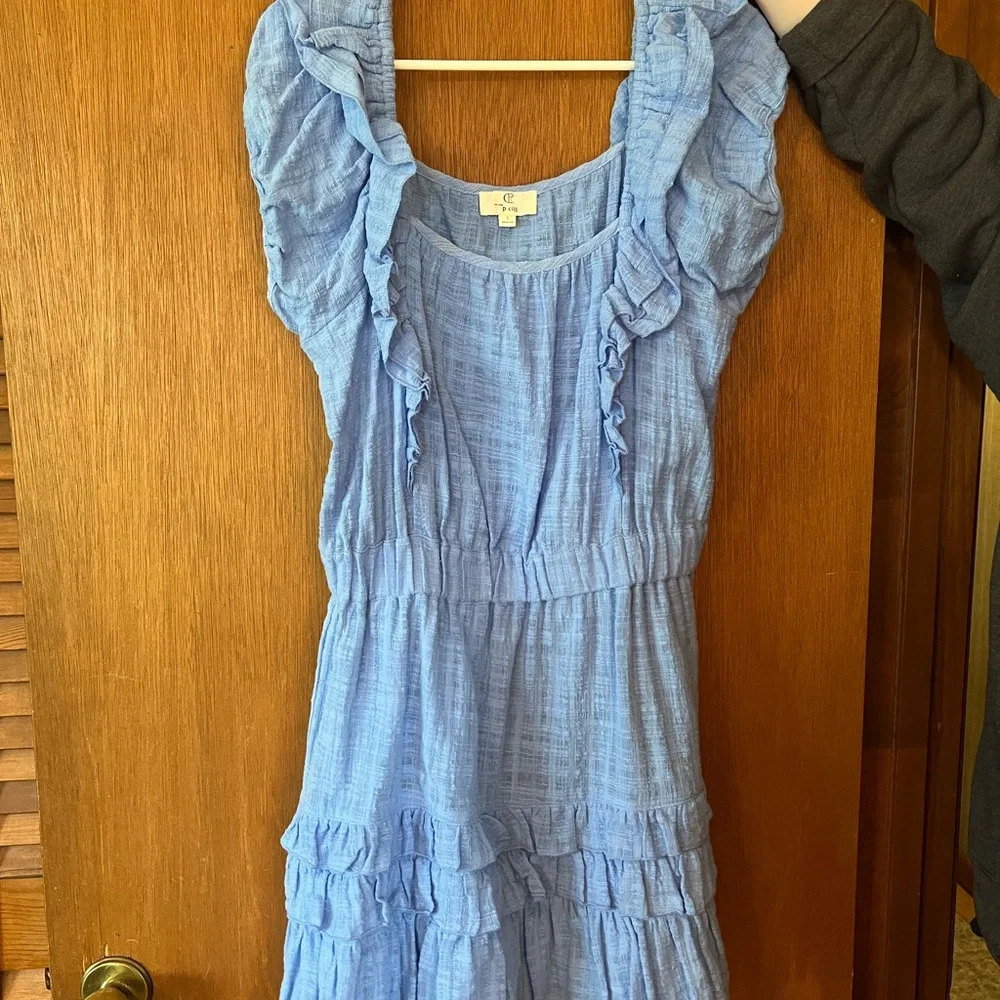 Charming blue dress with ruffled details. Perfect for casual outings.