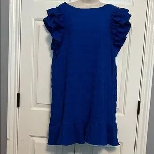 This charming blue dress features playful ruffles and has stretch to accentuate the curves, dress it up or down with shoes and accessories and it’s perfect for any occasion. Its vibrant color is beautiful and the double tiered sleeve is so flattering. 34.5”