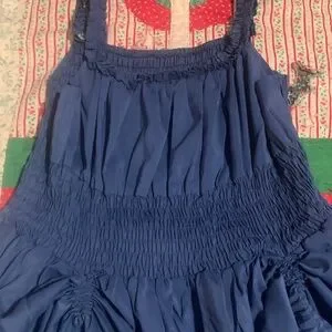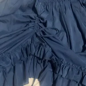 Elegant blue dress with ruffled details and white accents. Perfect for special occasions. Adjustable hem. White underlay slip . Silky rayon . Shoulder Straps have buttons w 2 buttonholes . Stretchy elastic waist and top. XL