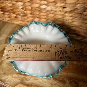 A beautiful white with blue edged ruffled small display piece. Good use condition no chips or cracks, just under 4 inches in height. Please refer to all photos for current condition and measurements