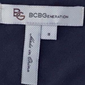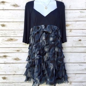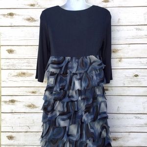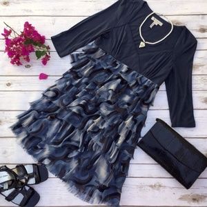 Blue dress with ruffled layer and 3/4 sleeves by BCBGeneration. Tiers of printed chiffon-like ruffles have unfinished edges and give this dress a "feathery" look. Top part is solid blue, the tiers are printed in different shades of blue, grey, black, and brown, side zipper. Shell and lining are 100% polyester, contrast is 95% rayon and 5% spandex. Size 8, measures about 15.5 inches across from armpit to armpit but has some stretch due to the spandex fabric content, and about 33 inches in length