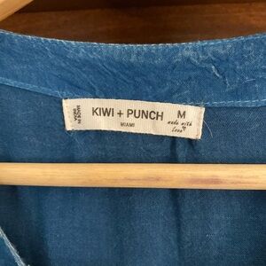 Chic and comfortable blue mini dress with ruffled sleeves. Perfect for casual outings. Back of dress is coming undone slightly, nothing a little sewing can’t fix! See pictures for details.
