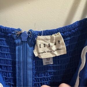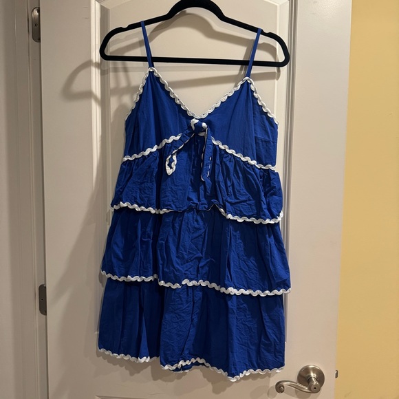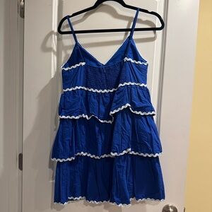 Chic and playful blue mini dress with ruffled layers and white trim. Perfect for summer outings.