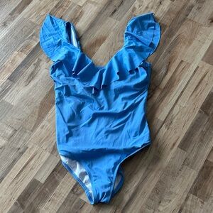 Stylish blue one-piece swimsuit with ruffled neckline. Perfect for sunny beach days.
