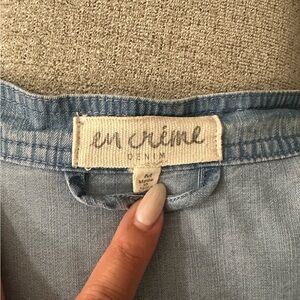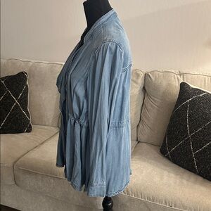 Stylish blue jacket with ruffled open front. Adjustable cinch at waist. Perfect for layering. Soft and flowy.