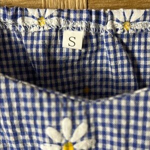 This elegant blue blouse features charming puff sleeves and a ruffled, smocked bodice for a romantic touch. The sleeveless design and light fabric make it perfect for warm weather outings.