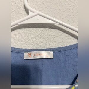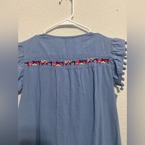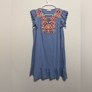 This charming mini sundress in blue is perfect for casual or resort wear. It features flutter cap sleeves and a ruffled hem, adding a playful touch to its design. The embellished crew neck offers a hint of elegance, making it a versatile choice for various occasions.