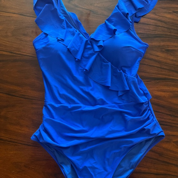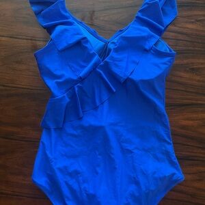 Stylish blue swimsuit with elegant ruffles. Perfect for a day at the beach.