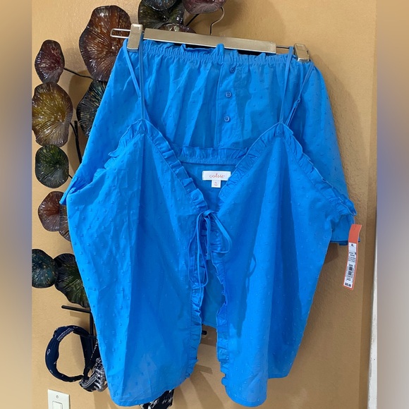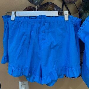 Stylish blue two-piece set with ruffled details. Includes a top and shorts.