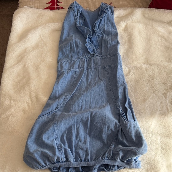 Denim blue dress with ruffle detailing, perfect for any occasion. Bubble bottom and has pockets