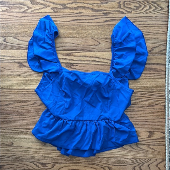 Elegant blue ruffled top with open back - perfect for any occasion. Add a pop of color to your wardrobe