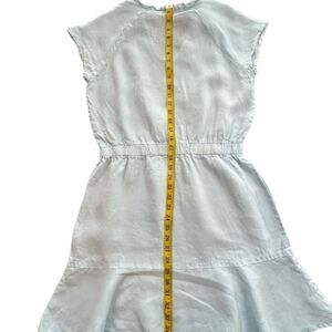 You will be cool and stylish in this 100 % linen dress from S'edge. It has an elastic waist and a v-neck that can tie. The bottom is a cute ruffle. This dress is a pale blue and is perfect for summer! It is in excellent condition with no stains or rips and will be shipped with care from a smoke free and pet free environment. Please note, some colors and measurements may vary slightly due to differences in lighting, position or screen resolution.